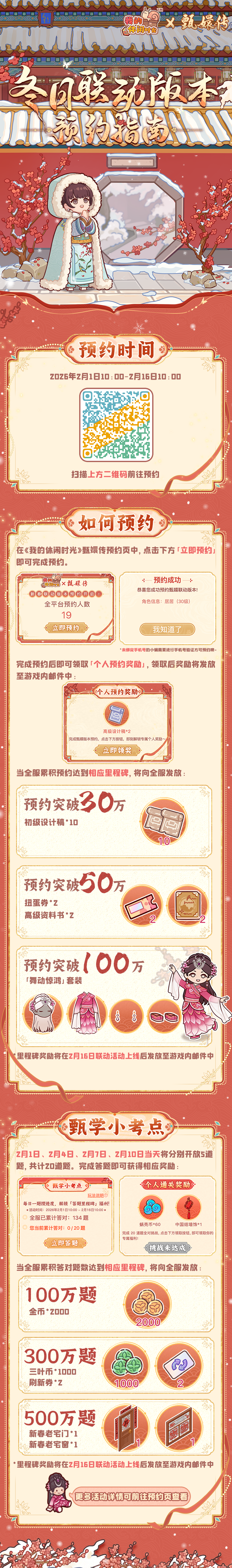 ❄️《我的休闲时光》×《甄嬛传》冬日联动版本预约开启!2月1日-2月16日10:00期间,前往版本预约页完成预约即可领取相应奖励,全服预约数累积达100万将向全服免费发放限定联动套装「舞动惊鸿」!更有「甄学小考点」等你来参与,快来一起看看吧~