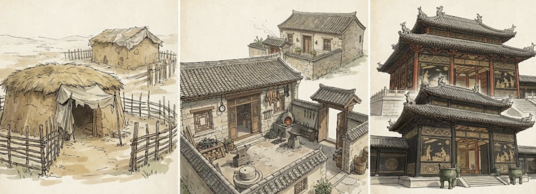 我们深知,当前的帐篷木栅仅是乱世求存的起点。在真实的历史长河中,聚落的演进本就是一部技术、资源与人文组织的壮阔史诗。因此,我们为《烽沙》中的每一栋建筑,都规划了一条 “三段生长” 之路——这不仅是外观从茅茨土阶到高台华宇的视觉蜕变,更是功能、效率与战略意义的全方位觉醒。