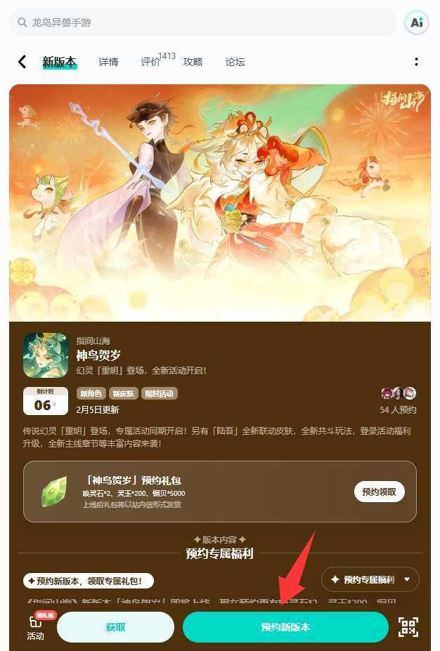 星主们也可以在个人界面中,点击“我的游戏”,找到《指间山海》游戏,点击新版本弹窗,即可进入“预约新版本”界面。