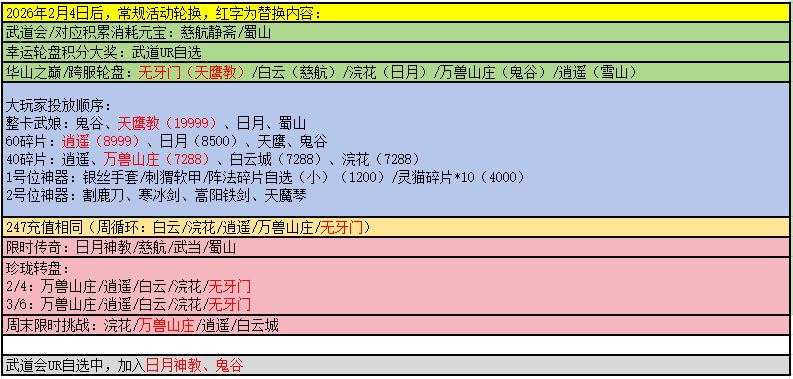 随着新武娘的即将上线,我们也将对常规活动轮换进行调整,以下是具体轮换活动的排期,红字为替换内容: