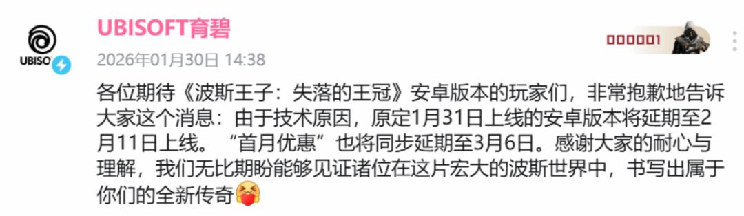 育碧今日突然发布公告,宣布原定于1月31日登陆安卓平台的类银河恶魔城大作《波斯王子:失落的王冠》国服移动版,因技术问题紧急延期。官方发布道歉声明,为彻底解决现存技术问题,将安卓版上线时间调整至2月11日,原本的首月优惠活动也将同步顺延,至3月6日正式结束。