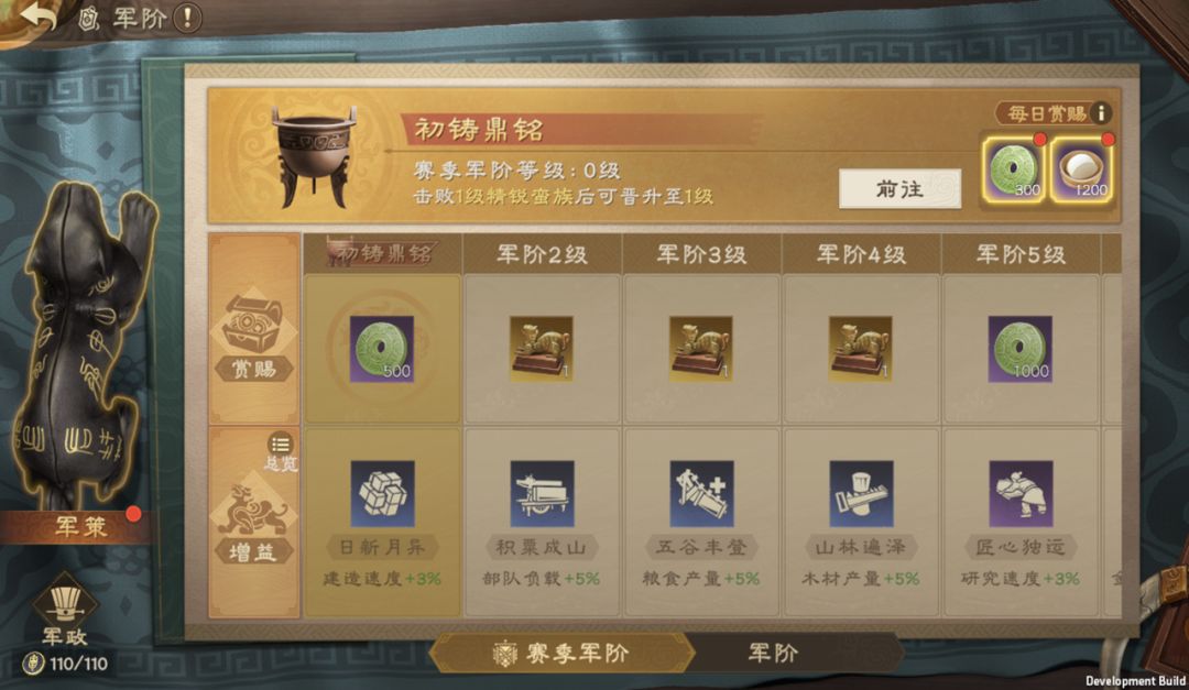 【赛季军阶】更新,击败精锐蛮族将可领取海量赛季军阶赏赐。全部通关可获得6000金铢、59英豪令以及大量增益。