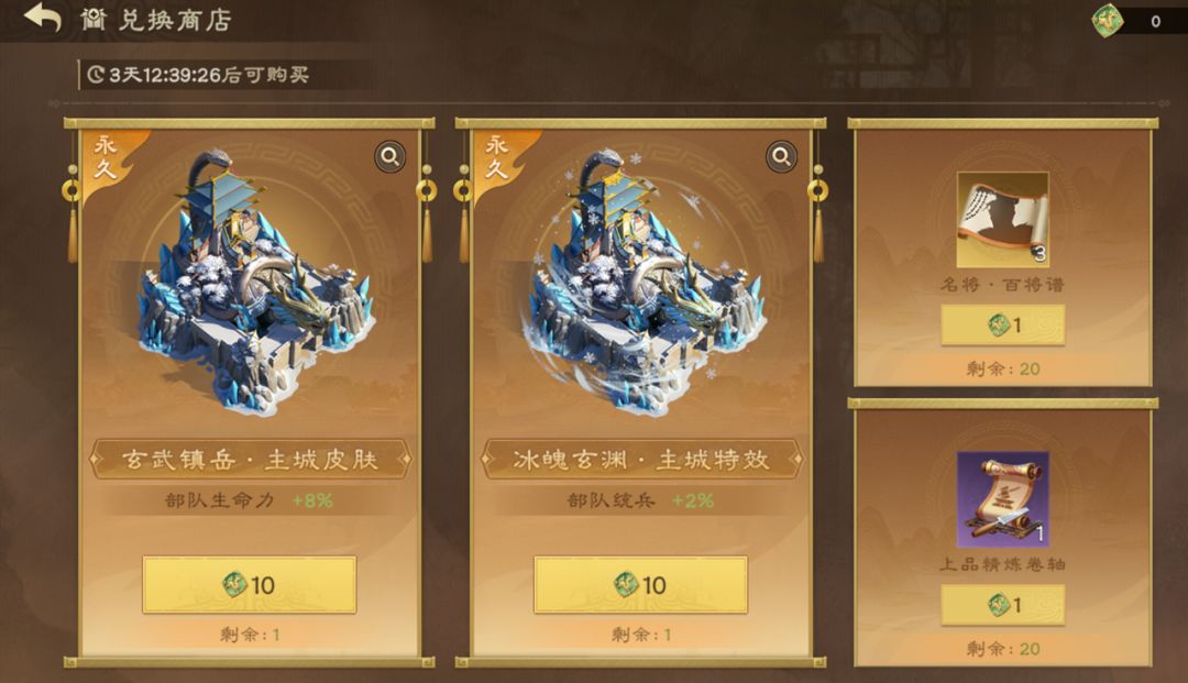 · 也可消耗九州币直接兑换“玄武镇岳”主城皮肤以及“冰魄玄渊”主城特效;