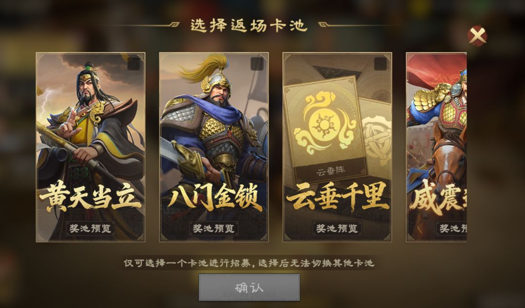 · 一旦选择要返场的限定卡池后将不可更改,请主公谨慎选择。