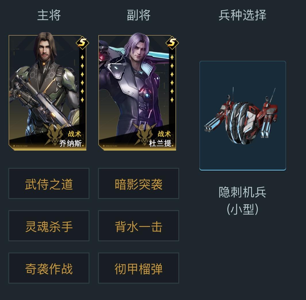这里推荐如果使用小中型兵种打机动和游击战可以选择背击流,使用艾拉和杜兰提搭配维妮娜。本赛季还加入了新英雄乔纳斯,也可搭配杜兰提组成背击队,且其增强自爆伤害与降低军械消耗的能力,可大幅降低第三输出队的战损。