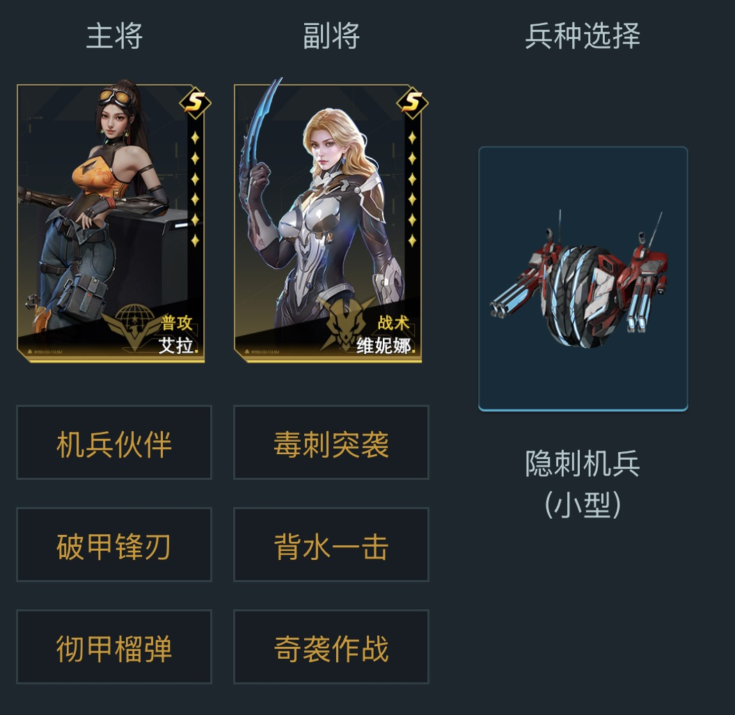 尽量使用隐刺机兵开启隐身拦截偷袭敌军落单部队,如果正面作战则作为第二三输出点配合其他队伍进行安全输出即可。