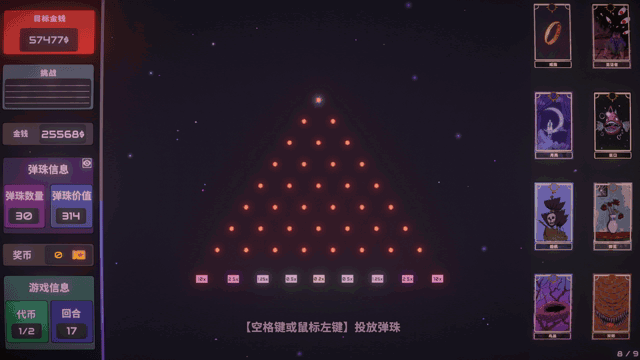 《心跳弹珠台》是一款结合了肉鸽要素的弹球游戏,游戏的玩法非常简单,在游戏开始后使用空格或者鼠标将弹球投下。弹球会在九层的挡钉塔内进行自由下落,在最后一层下时根据弹珠的价值和倍率结算这一轮游戏的金钱。只要能在回合次数内达成既定目标的金钱数,就算过关,反之则游戏结束可以重新开始了。