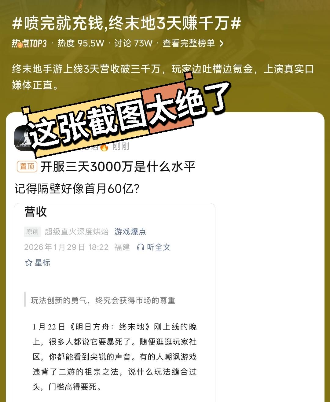 三天狂揽三千万流水 终末地神了