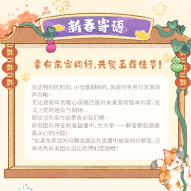 这一次,您写在“新春寄语”中的每一条游戏建议或未来期待,都将被小宝郑重收集,而且其中有价值的想法与反馈,将有机会在本次新春官方直播中被策划大大采纳并现场解答!