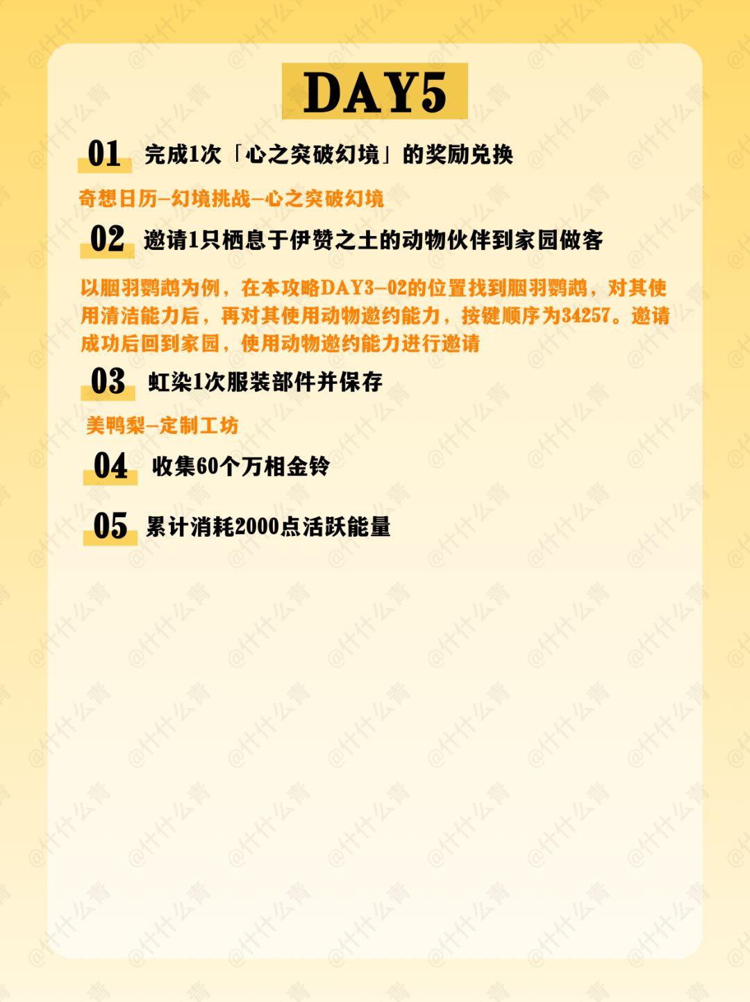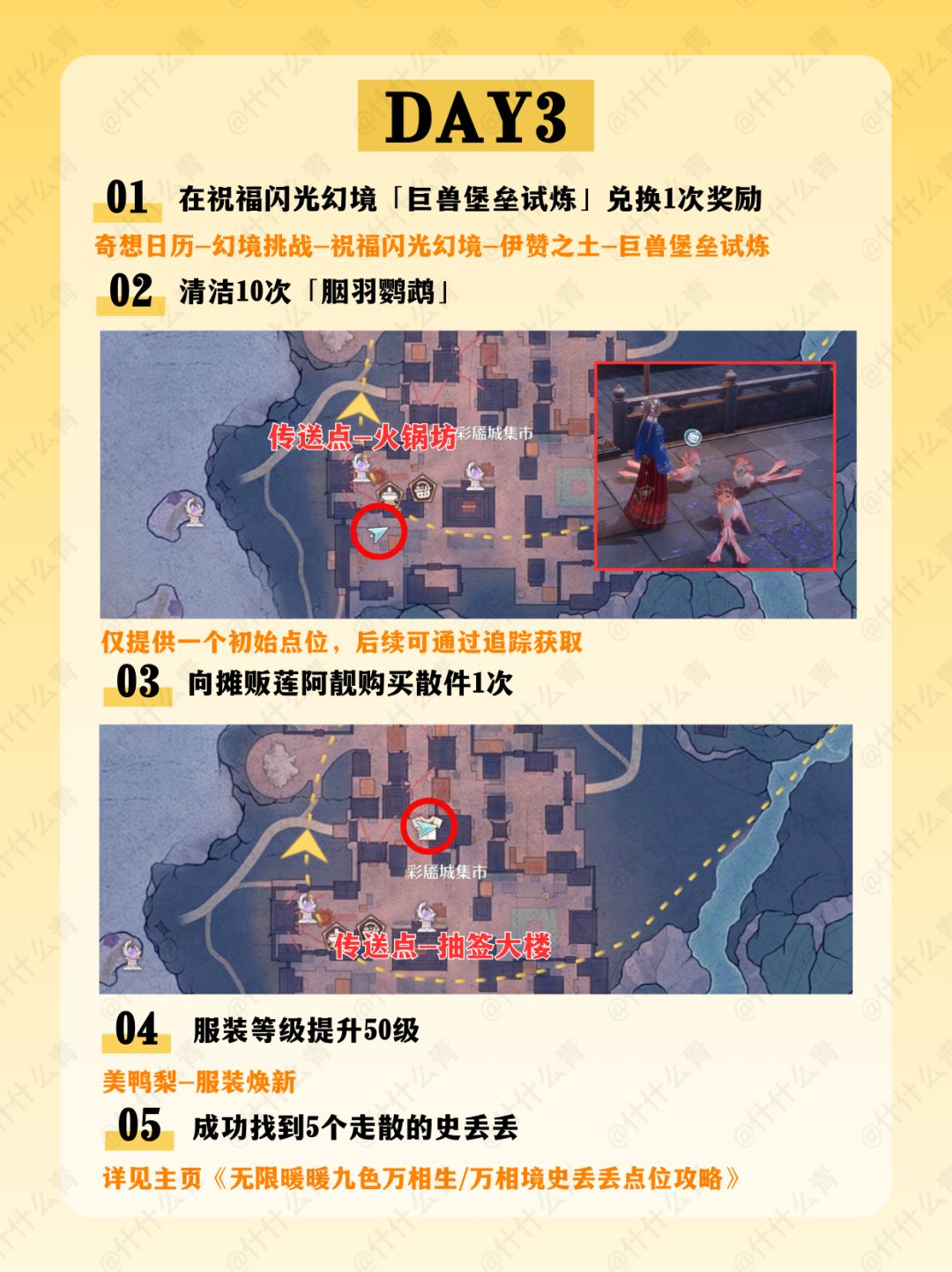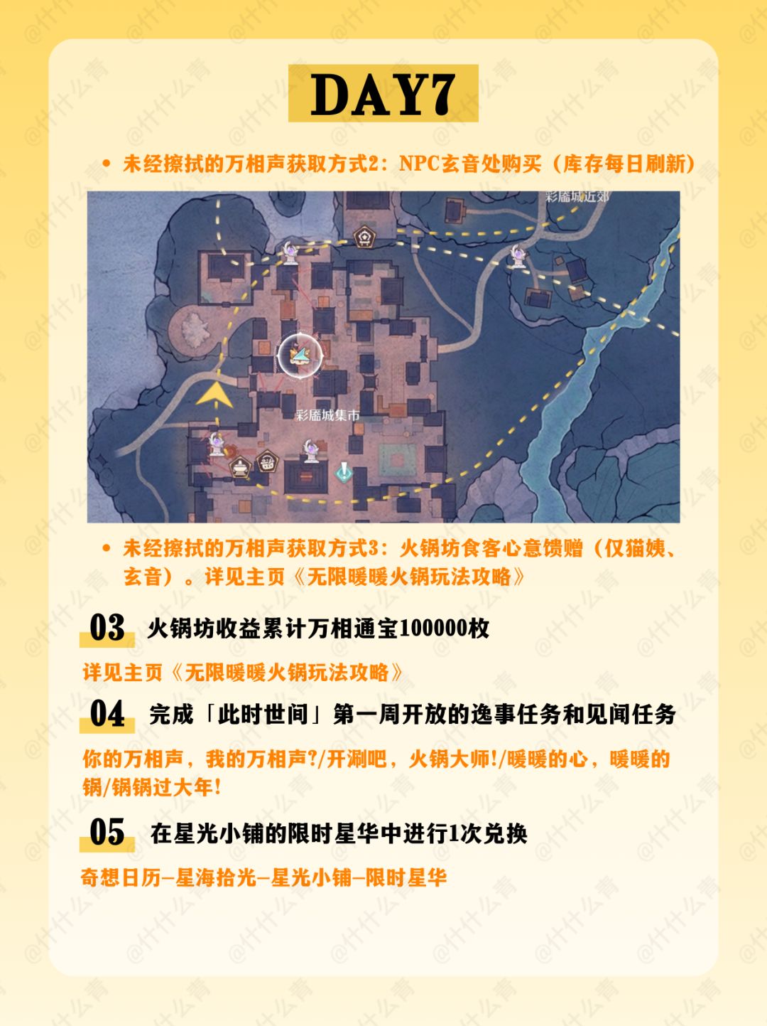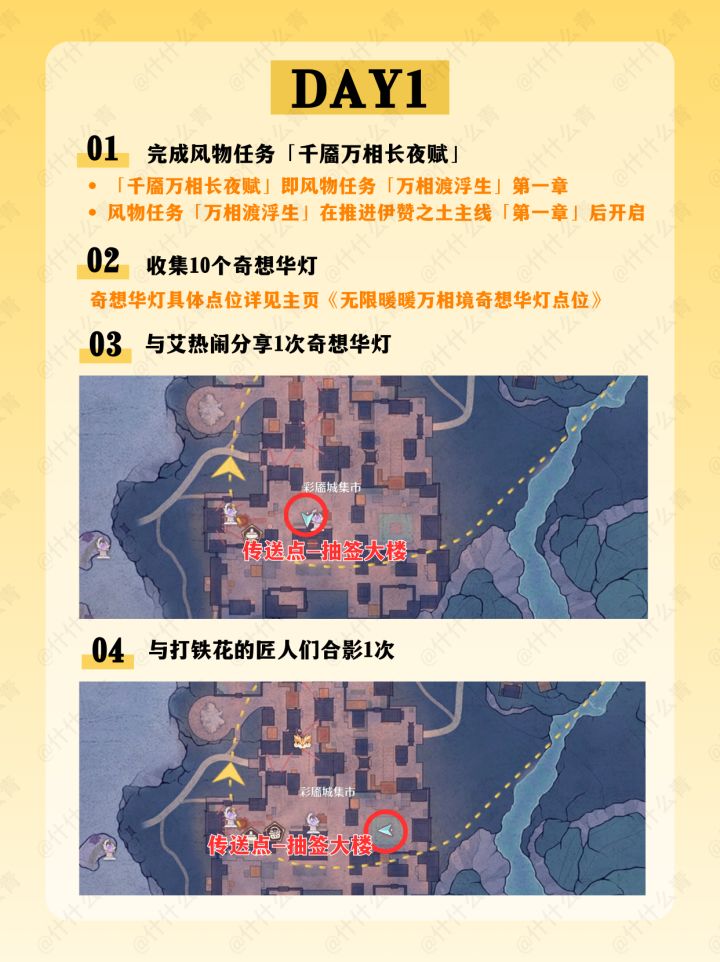 千靥万相长夜赋/奇想华灯/艾热闹/与打铁花的匠人们合影/火锅坊升级/接待食客/空鸣峡山君宝龛/金玉满盘十里飘香/清洁胭羽鹦鹉/摊贩莲阿靓/邀请1只栖息于伊赞之土的动物伙伴到家园做客/万相境的谜题空间/万相声点位/万相渡浮生/福运锵锵/开匣见宝/百变!搭出烟火气