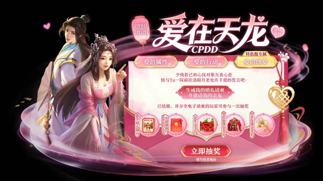 不仅如此,分享电子请柬还能参与抽奖,春节双人游礼金、999恋爱基金等重磅好礼直接宠到底,把情人节的甜蜜拉到顶峰!(注:轻松11服的该活动,将于2月4日正式上线,少侠们可提前解锁爱的仪式感哦~)