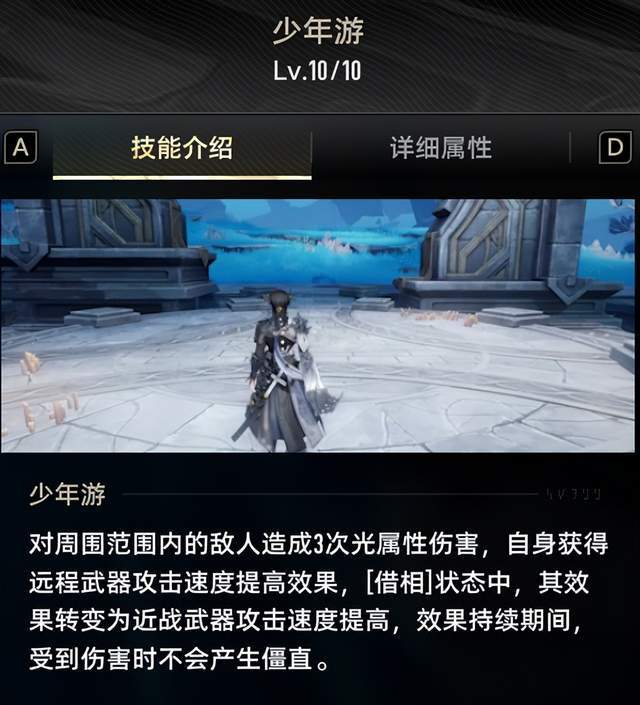 看看技能,小技能少年游,三次光属性伤害,获得远程攻速提升,攻击硬直免疫,另外大招状态E的效果转变为近战攻速提升,一个E技能BUFF够覆盖远程大招近战一套时间了,记得看效果槽续上E的BUFF,不过理智充足也可以一边A一边放技能,这个消耗确实不大也不会打断攻击。