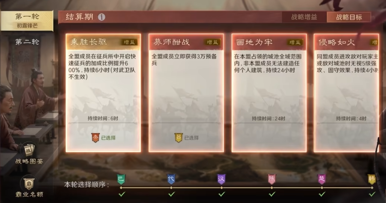 「战略卡」拥有强力效果,运用得当可对战局产生显著影响。并且每个战略卡都有对应的战略目标,同盟完成本轮所选择战略卡的战略目标,都会对应获得20个同盟非问鼎霸业名额,未完成战略目标则获得10个霸业名额。