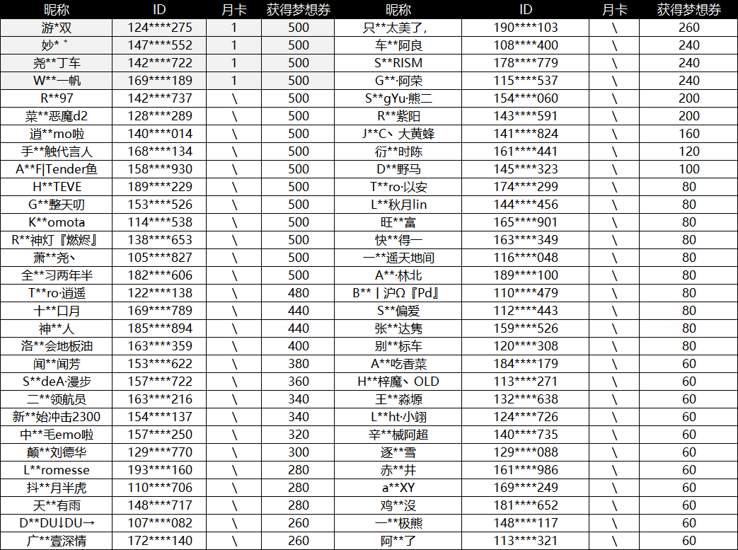 单周排行榜奖励:单轮第1-3名分别获得100/80/60张梦想奖券;每周总榜单前4名额外各获月卡1张;