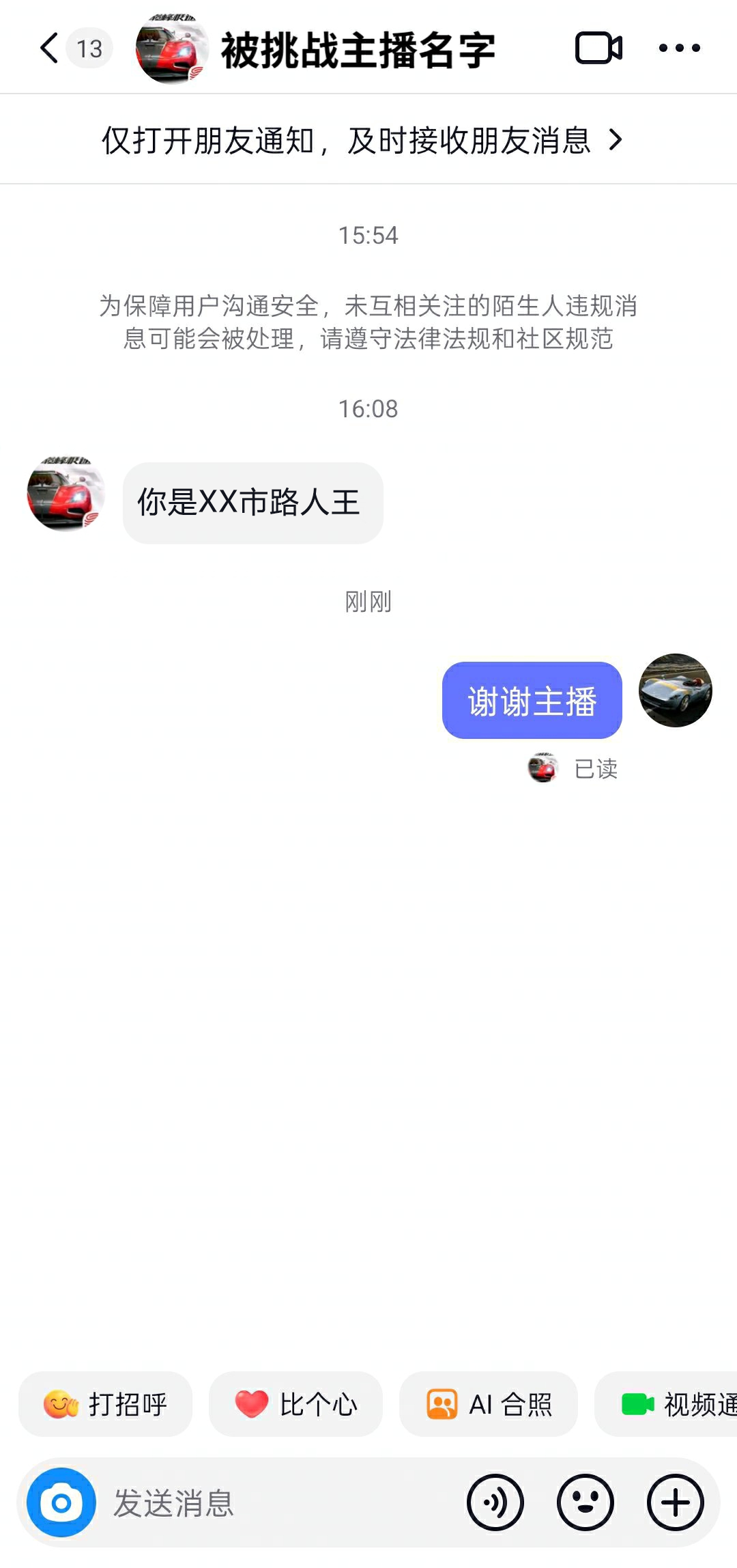2、每位主播的输赢规则由主播自己制定,完成挑战后,主播发送“你是xx市路人王”至车手私信