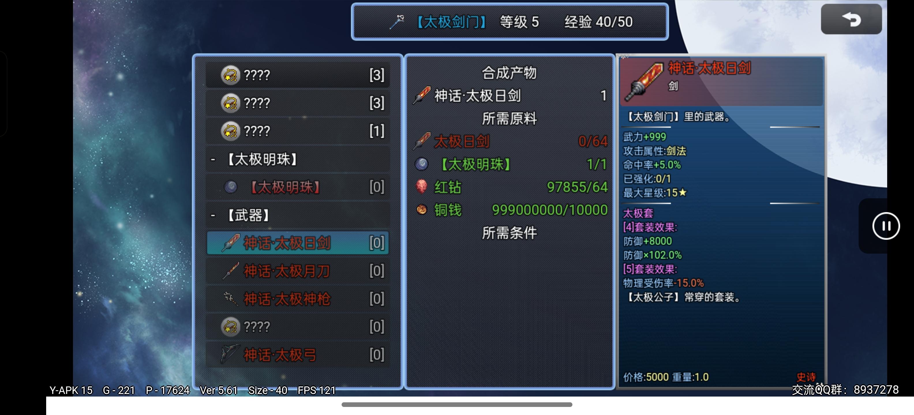 太极副本门口进行兑换,99个碎片合成一个太极明珠,太极武器64个合成,套装为防御套