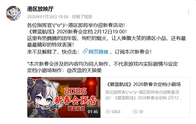 1月30日,碧蓝航线社区正式宣布2026年度新春会将于2月12日晚间通过线上直播形式与全球指挥官见面,这场以“瑞启新程,再续华章”为主题的年度盛会,将由玩家自发组织策划,呈现包括同人动画音乐原创、趣味配音等多元内容![[TapTap表情|TapFamilyxdoro2_粉狗比心]](https://img.tapimg.com/market/images/101c7e3200596fe8e03765080b467fb8.gif)