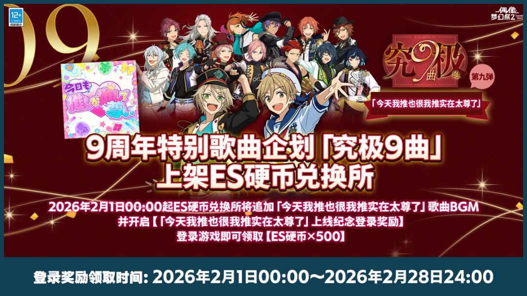 2026年2月1日00:00起ES硬币兑换所将追加「今天我推也很我推实在太尊了」歌曲BGM并开启【「今天我推也很我推实在太尊了」上线纪念登录奖励】