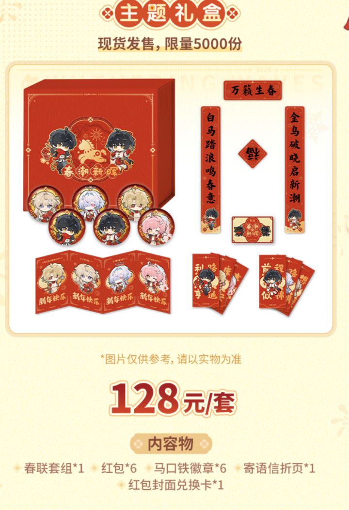 1月30日库洛游戏官宣,《鸣潮》「春潮新晖」主题礼盒及系列周边将于1月31日9点现货发售,礼盒定价128元/套,全球限量5000份,同期还将上线主题门挂、咔咔扣毛绒等周边,为玩家带来新春收藏好物。