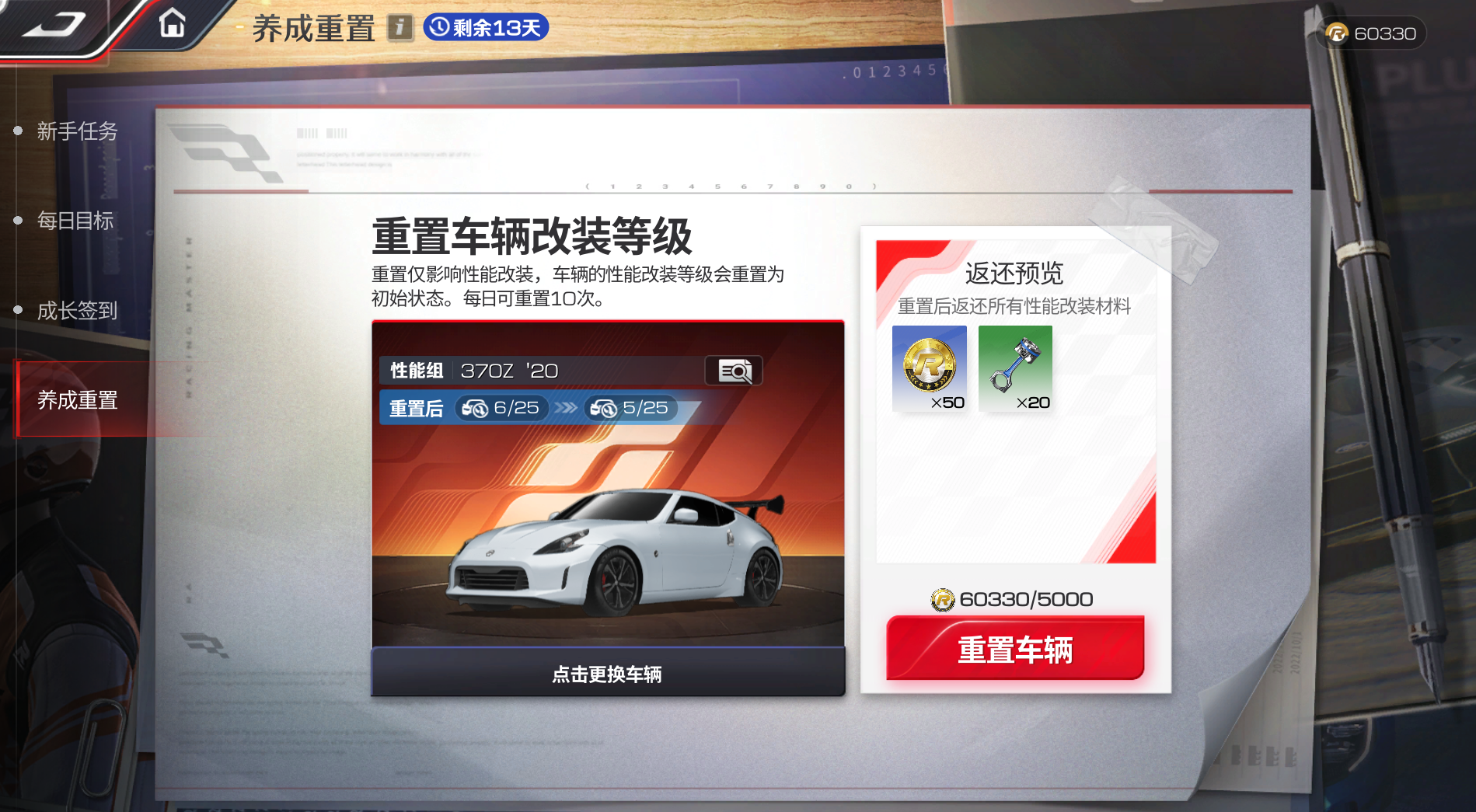 新手保护期再加码!创角前14天内,你可以随时在活动页面重置任意已改装车辆的性能等级。