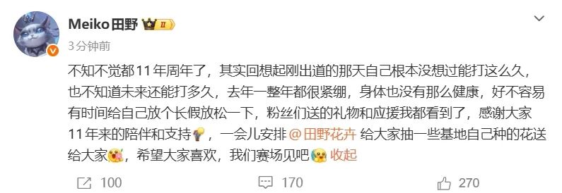 Meiko迎来LPL出道11周年 发文致谢粉丝并官宣赛场再会