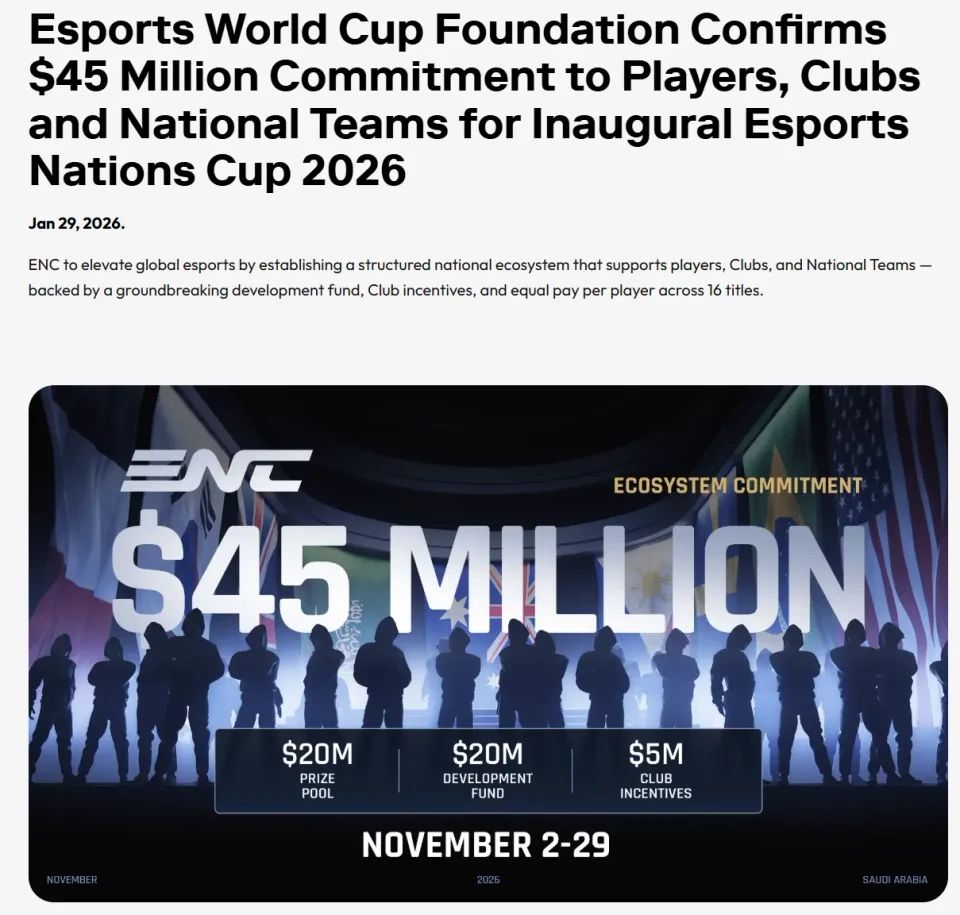 1月30日消息,沙特阿拉伯利雅得当地时间1月29日,电竞世界杯基金会(EWCF)正式公布2026年电竞国家杯(ENC)的举办日期与奖金体系。这一以国家队为参赛主体的全新全球顶级电竞赛事,首届赛事定于2026年11月2日至29日在沙特利雅得举办,总投入达4500万美元,将为全球电竞生态带来全新的国家级竞技维度。