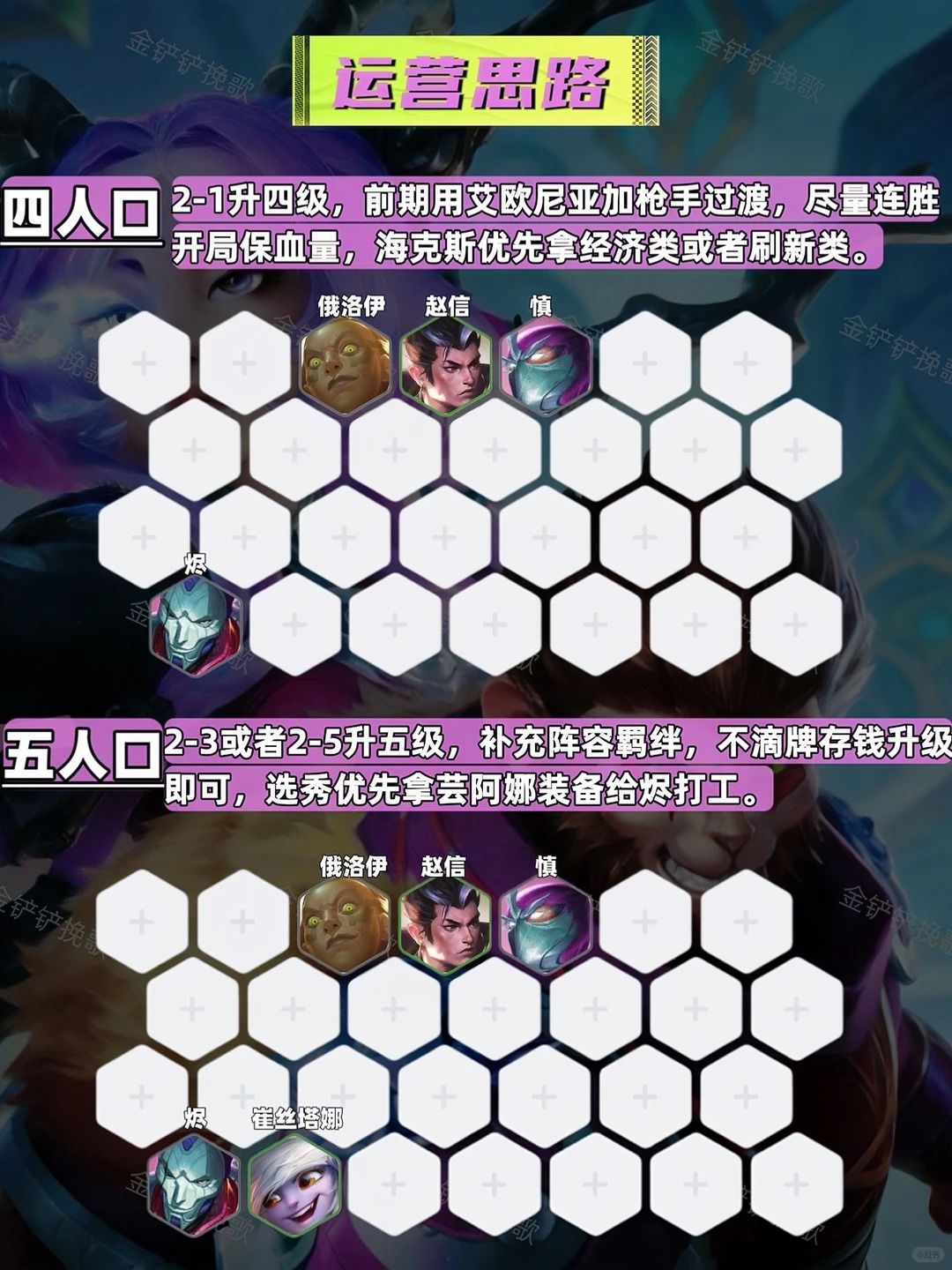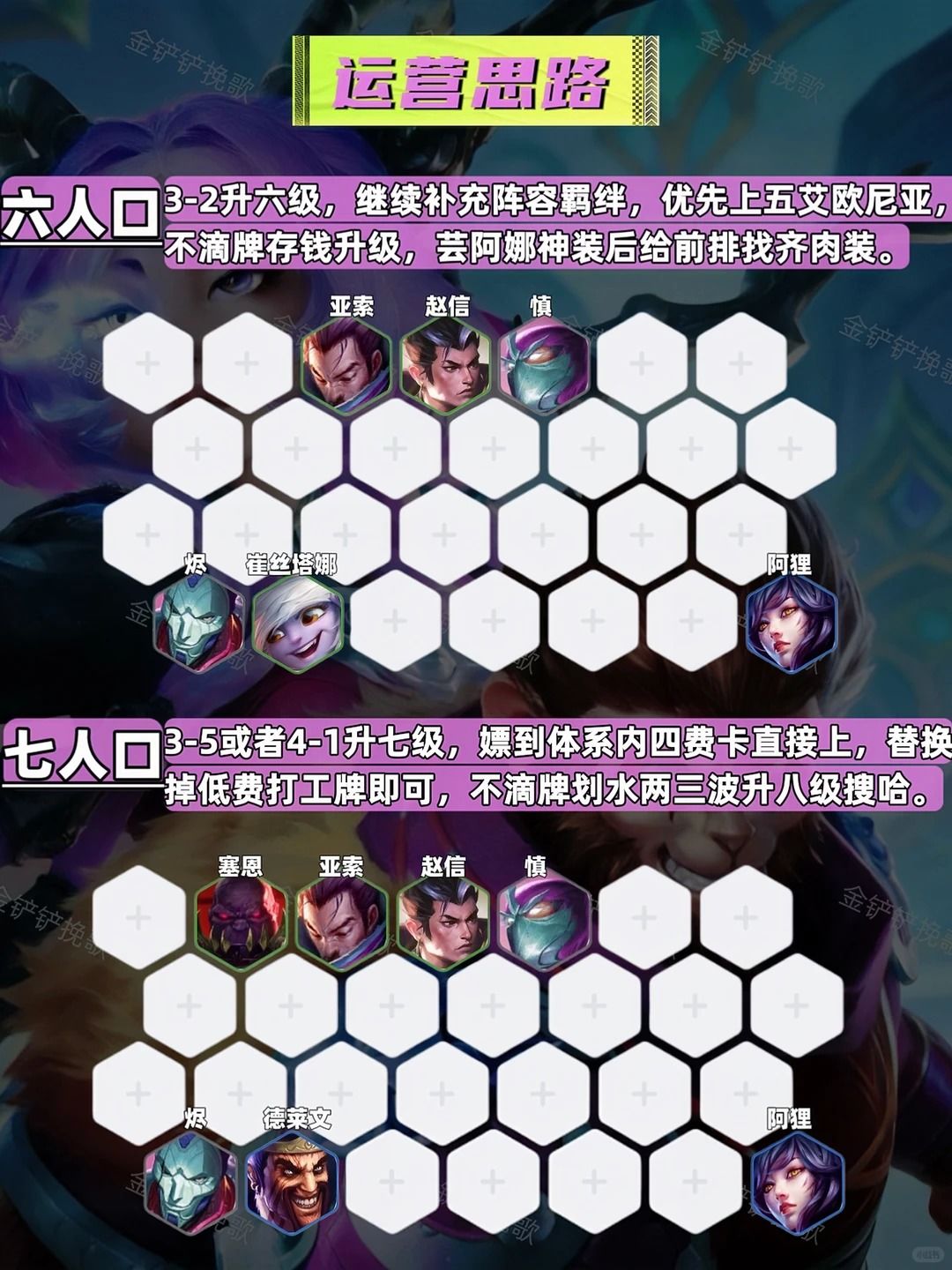 2-3或者2-5升五级,补充阵容羁绊,不滴牌存钱升级即可,选秀优先拿芸阿娜装备给烬打工。