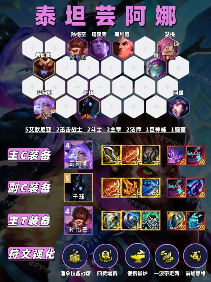 芸阿娜开启技能后可瞬间叠满泰坦层数,配合艾欧尼亚的双攻加成,能直接融化敌方后排,且全程免控。