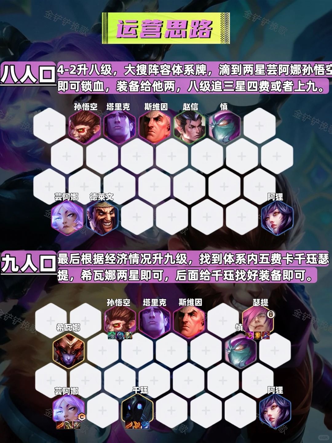 4-2升八级,大搜阵容体系牌,滴到两星芸阿娜孙悟空即可锁血,装备给他两,八级追三星四费或者上九。