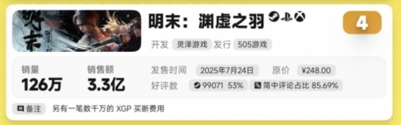 不过,榜单上最受关注的,可能还是排在第四的《明末:渊虚之羽》,这款游戏的数据一直是个谜,这次终于亮出成绩单。