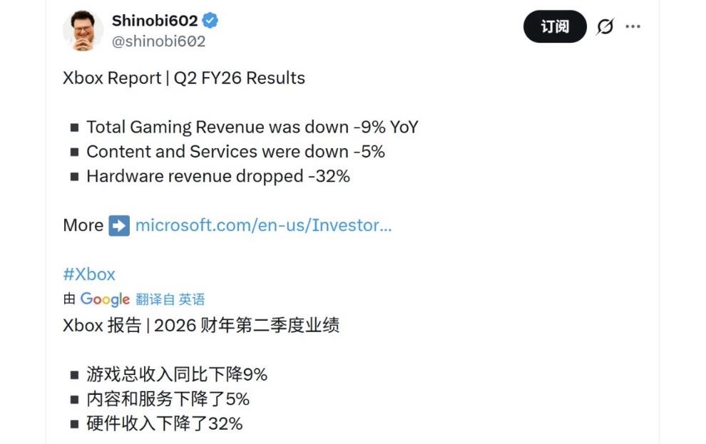 微软近期发布的财报显示,游戏业务收入下滑9%,硬件收入下滑32%,内容与服务收入下降5%,可谓全面下滑。