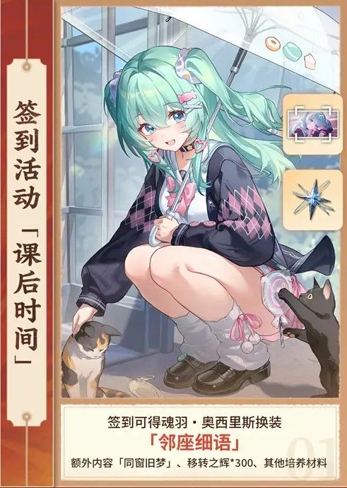 签到可得魂羽•奥西里斯换装『邻座细语』,额外内容『同窗旧梦』、移转之辉*300、其他培养材料