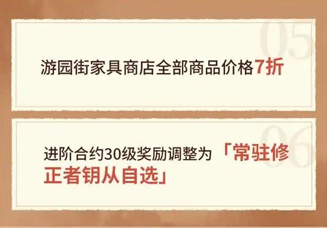 游园街家具商店全部商品价格7折,进阶合约30级奖励调整为『常驻修正者钥从自选』