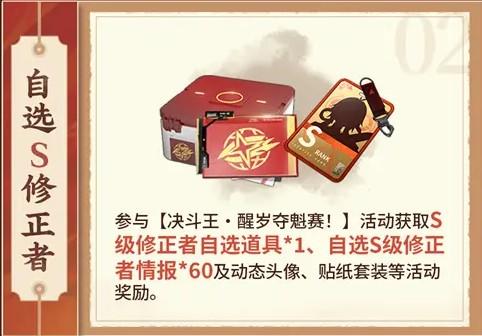 参与『决斗王•醒岁夺魁赛』活动获取S级修正者自选道具*1、自选S级修正者情报*60及动态头像,贴纸套装等活动奖励