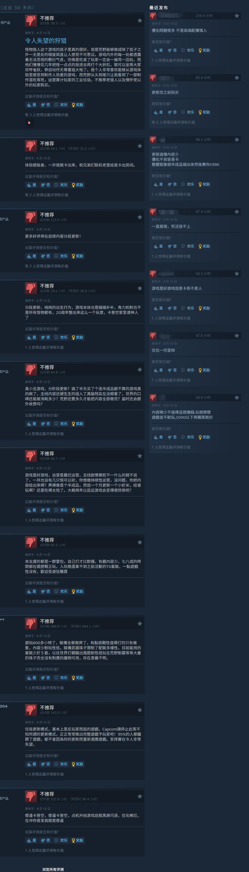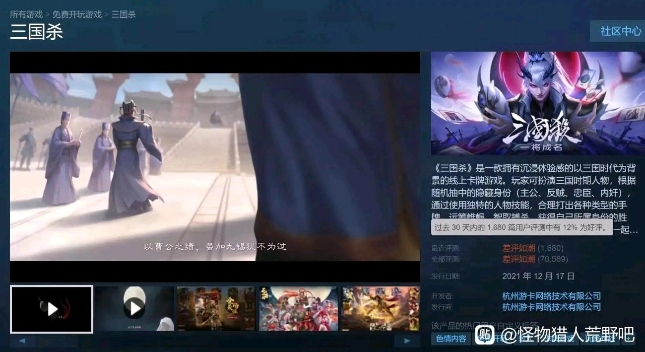 而在去年的6月,仅30天好评率《怪物猎人:荒野》更是一度跌至12%,直接追平《三国杀》。