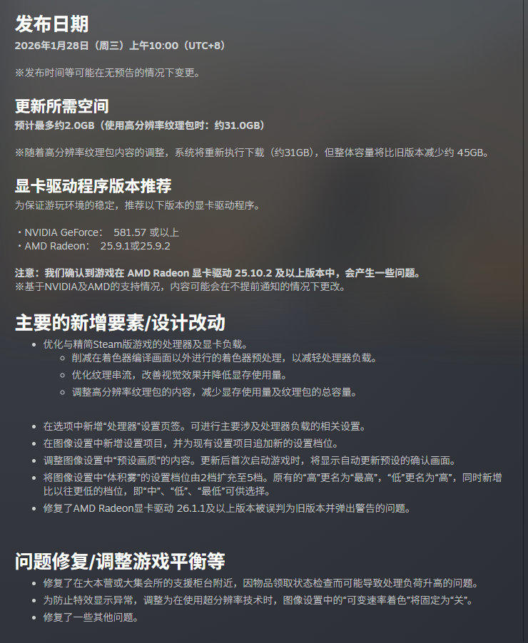 卡普空于1月28日发布PC专属补丁(Ver1.040.03.01),重点修复DLC检查漏洞,优化着色器编译与显存占用,新增处理器负载调节选项。