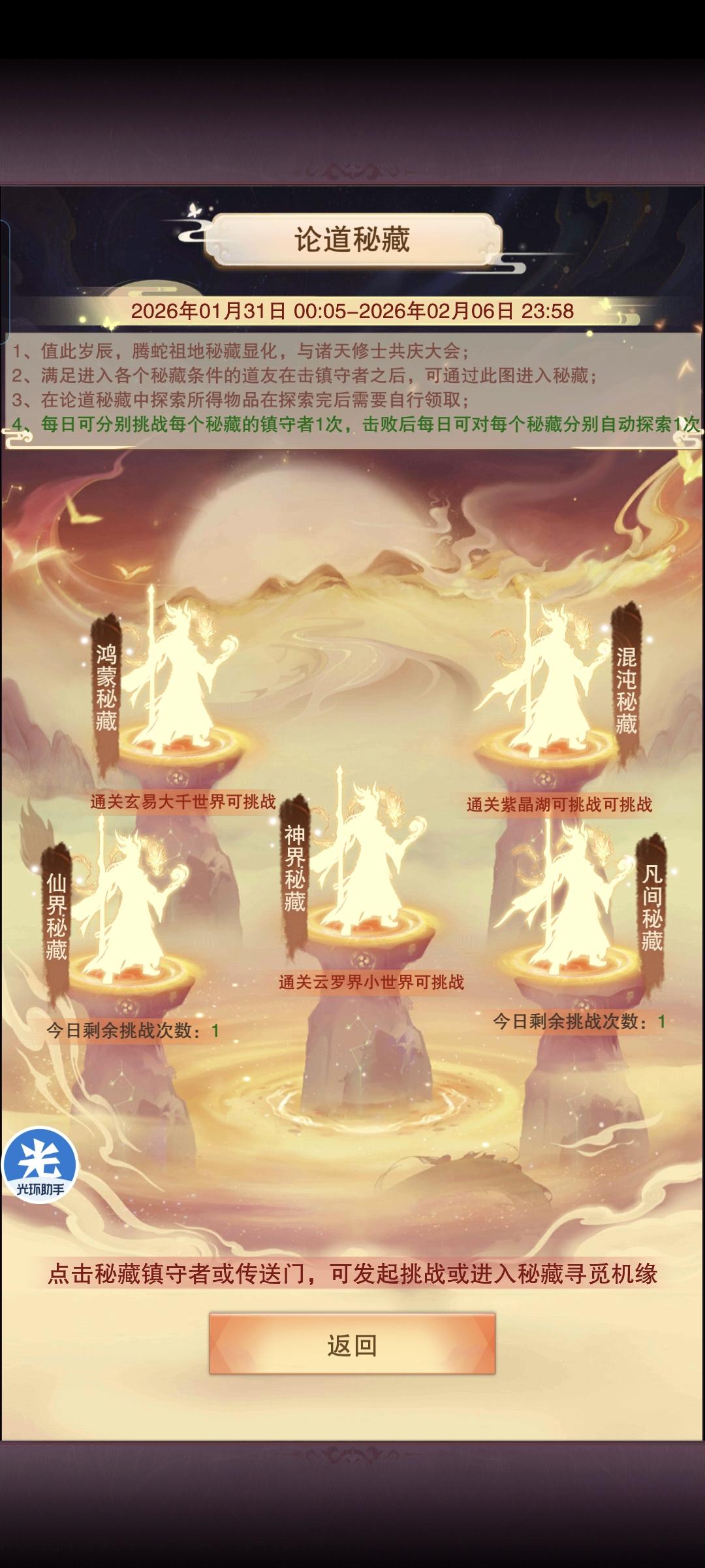 上天了的玩家:先挑战凡界密藏,正常探索,等每天属性提不动了,再去试试挑战仙界密藏,如果过了,可以凡界仙界一起吃,每天吃两份直到论道大会结束