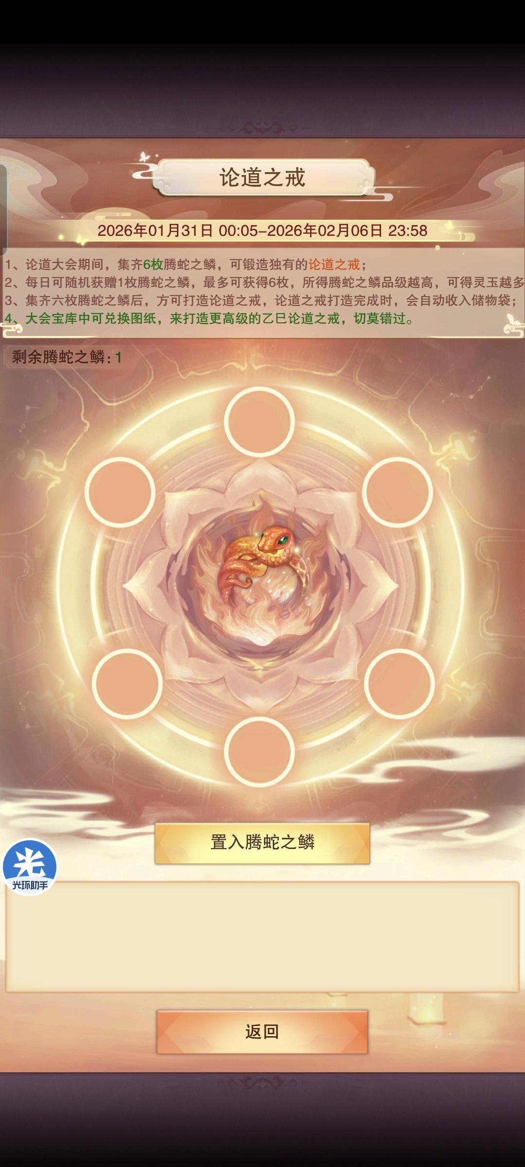 3.返回,点击论道之戒,进入如下界面,点击置入腾蛇之鳞