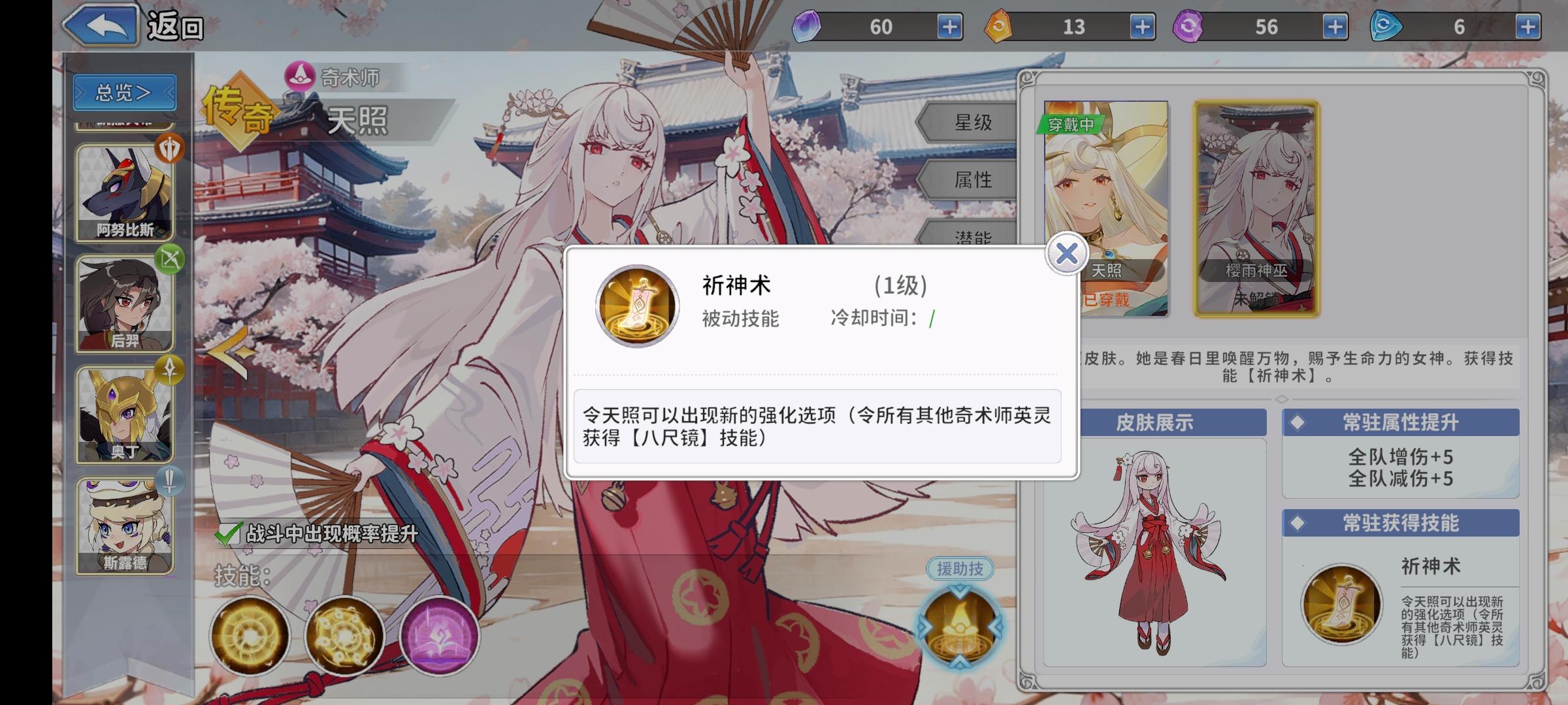 7级以后:优先拿天照,天照解锁后,有女娲就拿女娲,女娲只需要以下强化,炼金术士可以抓一只,但不要点他的强化,抓一只享受被动就够了。