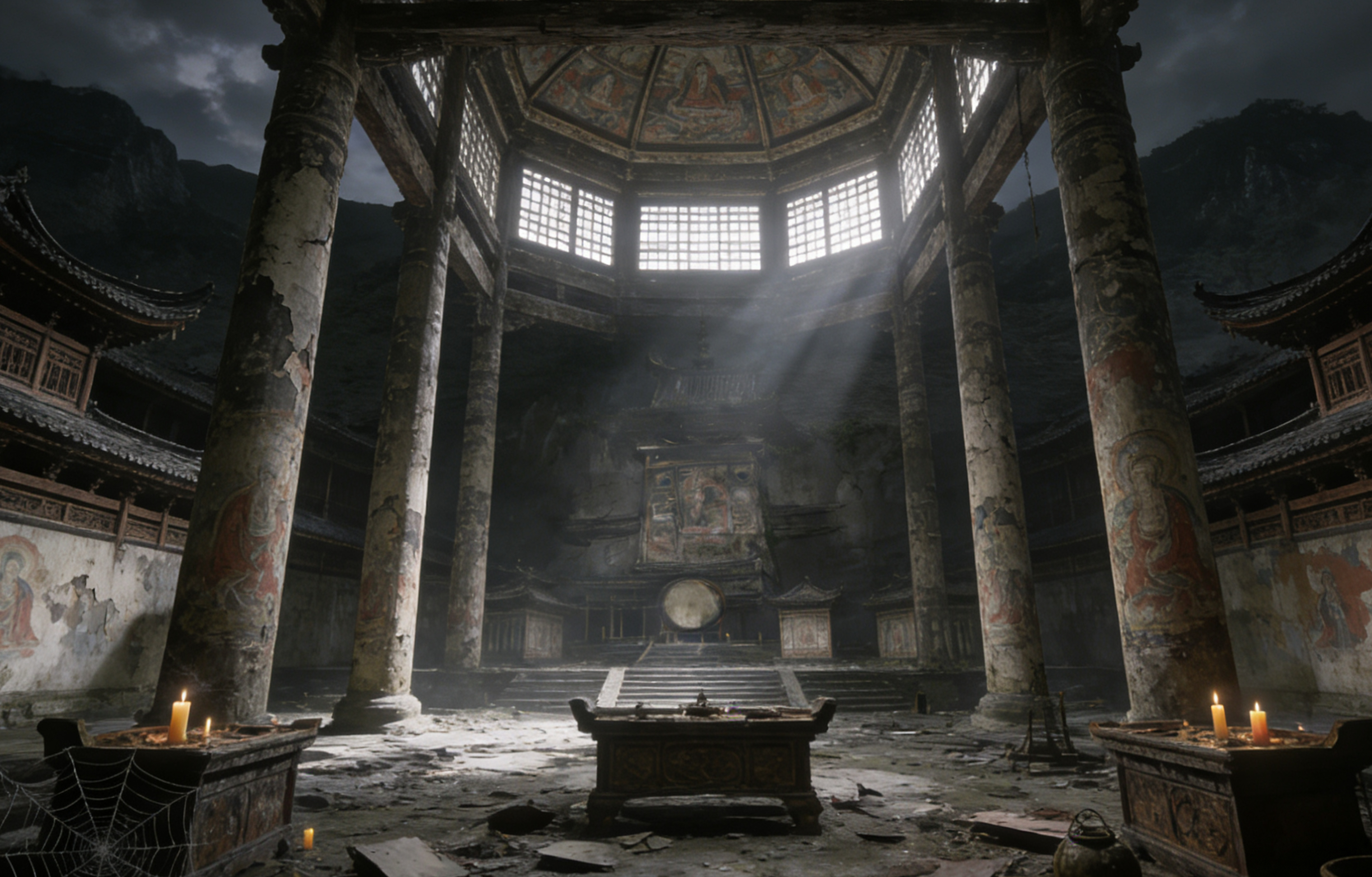 虽然是外景,但四周却是山壁,是处于天坑中央的建筑。