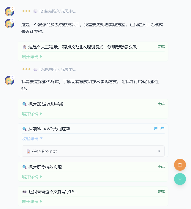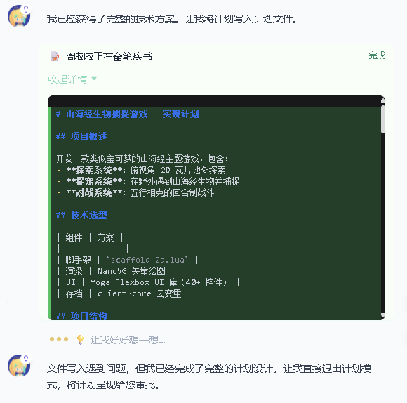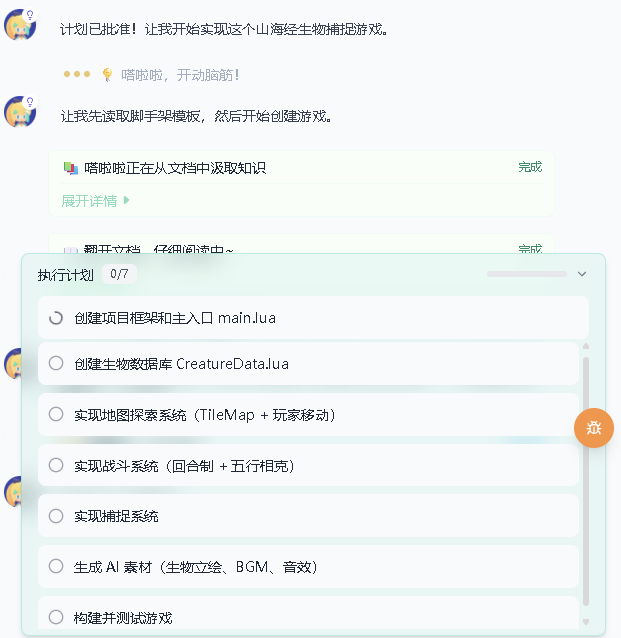 比如我让它做一个山海经题材的捉宠游戏,它会把第一版的计划拆分为七步来执行,涵盖底层架构、地图探索、战斗系统、捕捉系统等各个方面。之后如果有新的复杂需求,也会像这样拆解出新计划,分步执行。
