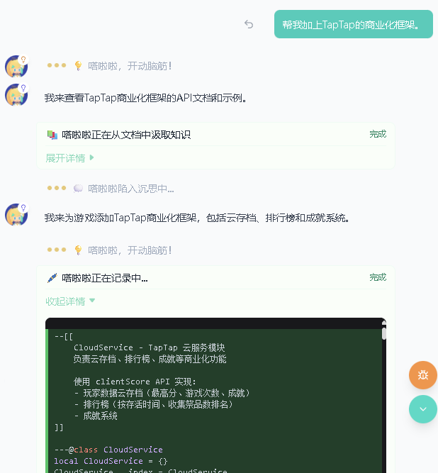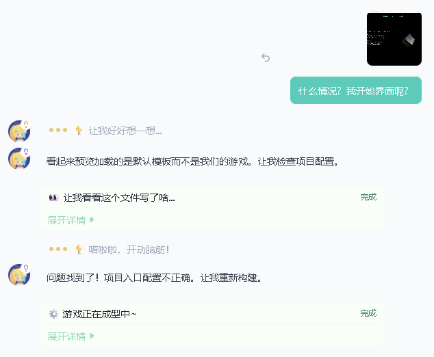 当然,做更复杂的游戏,过程中也难免更容易出现Bug。不过修Bug的事也基本不需要你多操心,只要复制错误提示,或者直接截图描述问题,嗒啦啦就会自己去找问题、自动修复了。