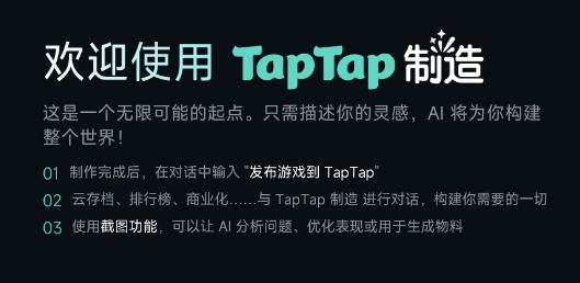 用官方说法来讲,TapTap制造是一款能通过文字对话,让AI帮你做游戏的产品,它的底层由AI智能体 + AI Native 引擎 + TDS(TapTap 开发者服务)三部分构成,覆盖面相当广——能写代码、生成美术素材、生成音乐音效、接入TDS功能接入,做完还能一键上架TapTap。