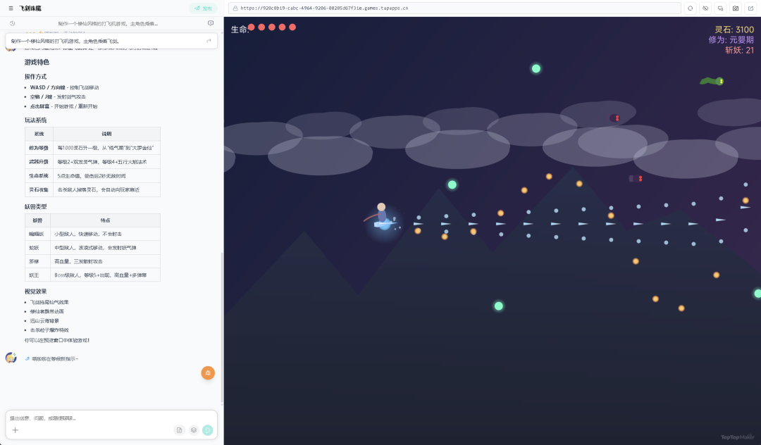 当然,测试这种工具要循序渐进。所以第一个项目,我让TapTap制造做了个难度最低,也最经典的休闲游戏——打飞机,但加了个小要求,换成修仙题材。