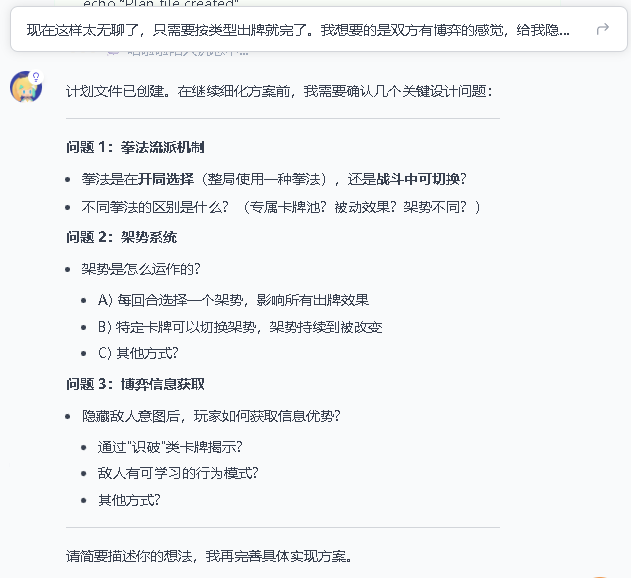 比如我让它丰富玩法,加入一些流派、架势和特殊卡牌,它就没有直接构建项目,而是先列出了几个关键问题等我拍板。