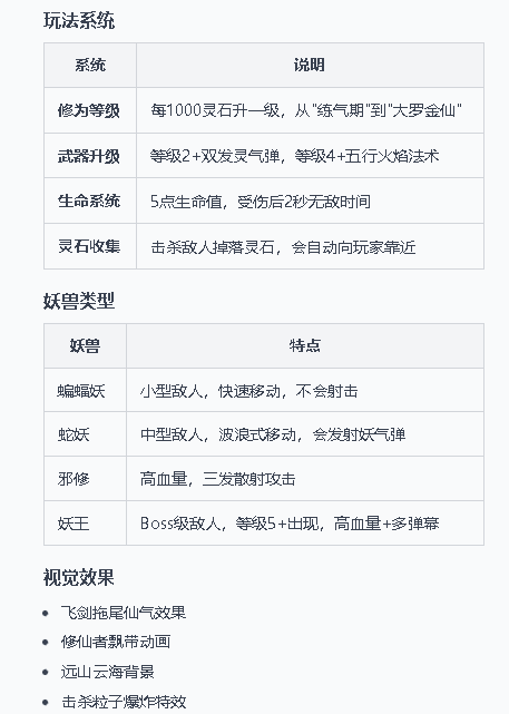 让我稍微有点惊喜的是,它自己补全了很多我没提到的需求,给角色加上了等级、武器进化,简单设计了几种怪物,甚至还超绝不经意地给飞剑加上了拖尾特效……
