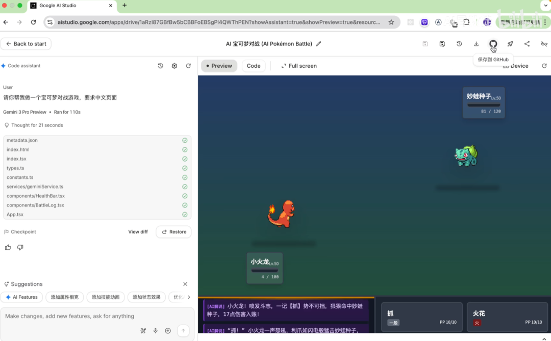 第一步验证成功。接下来我又提了更复杂的需求,尝试让它做一些中等难度的小型游戏,比如卡牌对战、捉宠RPG,还有俯视角探索等等。