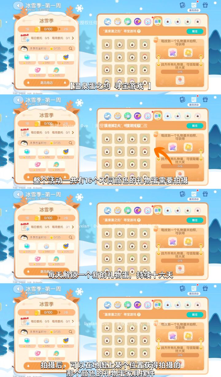 整个活动一共有16个不同颜色的礼物蛋需要拍摄,每天解锁一个新的礼物蛋,持续十六天。