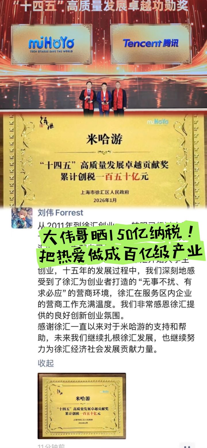 1月26日上海徐汇区招商引资表彰大会上,米哈游与腾讯共同斩获“十四五”高质量发展卓越功勋奖,联合创始人刘伟(大伟哥)朋友圈曝光的硬核数据,2021-2025年累计给徐汇区纳税150亿,年均30亿的缴税规模堪比不少小型上市公司的年营收!