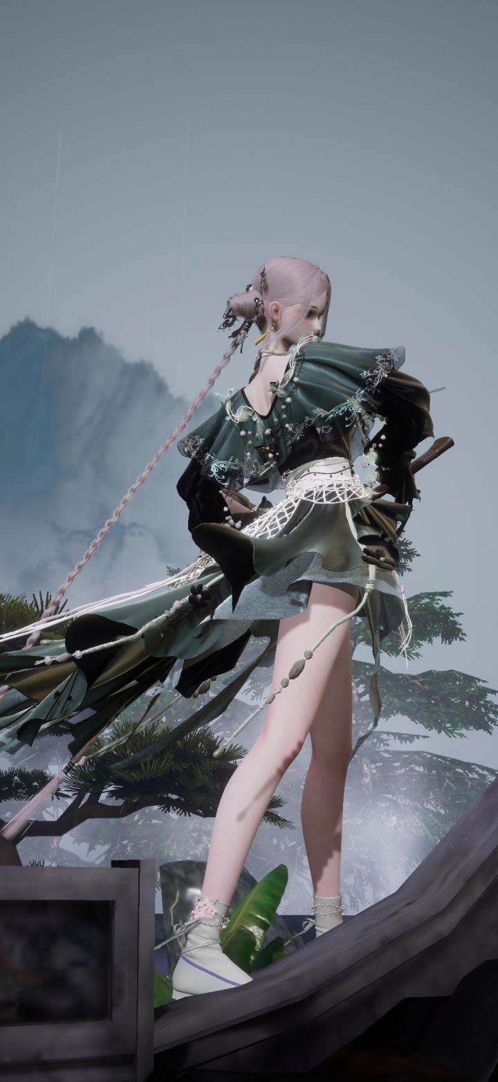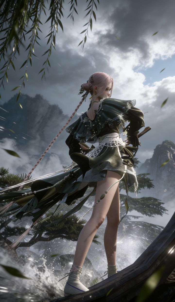 帮我生成图片:数字CG风格,UES渲染,超广角构图充满神秘感且细节繁复的云雾缭绕,前景柳叶飞溅点缀,动态模糊,天空被云雾覆盖,狂风肆虐,张力十足,恢宏浩荡,极具压迫感的景象,低饱和,强透视,极具视觉冲击力,光影交错,真实光线反射,墨绿灰白色调,白处冷亮锐利,灰处沉郁如墨,东方古风玄幻修仙氛围,8K摄影画质,
